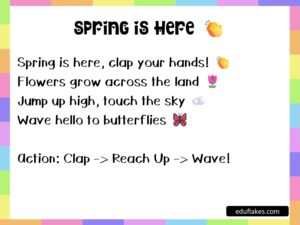 Start your day with spring motion rhymes for kids to energize your students. Rhymes like “Spring Is Here” are perfect for getting children moving and ready to learn.