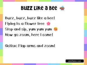 Rhymes like “Frog Jump Fun” and “Buzz Like a Bee” are perfect for quick energy bursts.